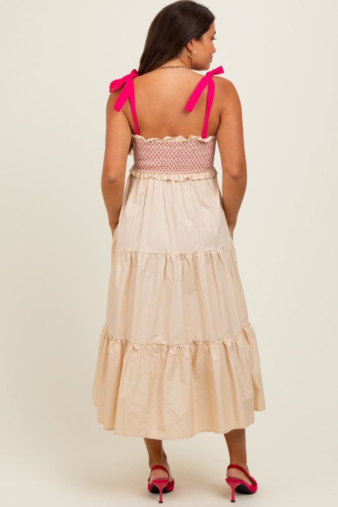 Cream Smocked Contrast Shoulder Tie Maternity Midi Dress