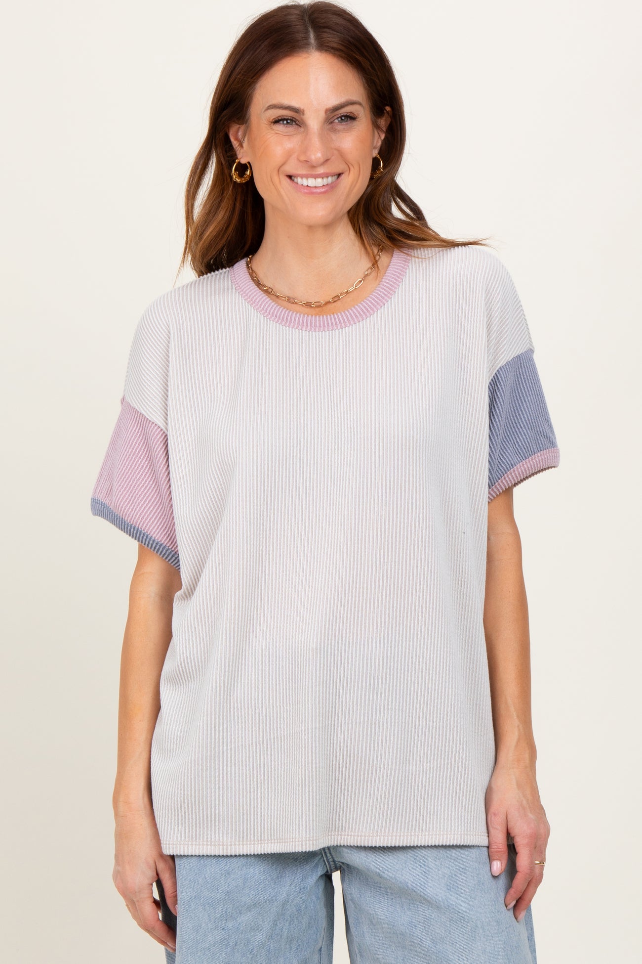 Cream Solid Ribbed Color Block Short Sleeve Tunic Top