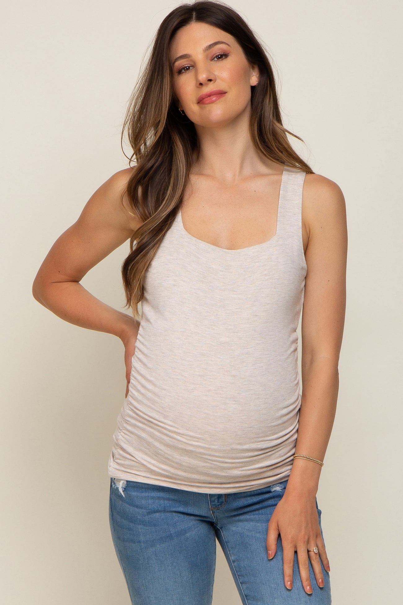 A double lined, soft knit, sleeveless maternity top featuring a square neckline and ruched sides.