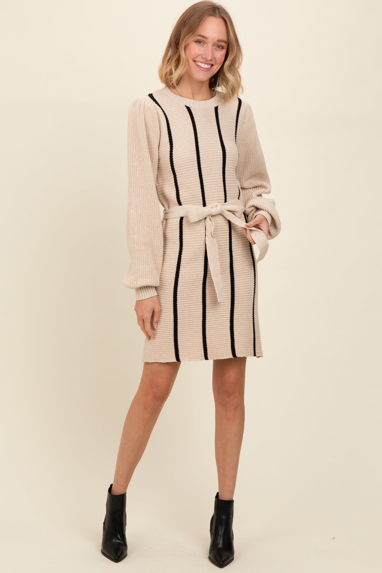 Step into cozy elegance with our Cream Striped Sash Tie Sweater Dress. Crafted with a soft, textured knit, this dress features vertical black stripes that create a slimming effect and add modern flair. The long sleeves with subtle puff shoulders offer a stylish touch, while the matching cream sash tie cinches the waist for a flattering silhouette. Perfect for casual outings or dressed-up occasions, pair it with your favorite ankle boots or heels for a chic, effortless look. Embrace warmth and style this season with this must-have versatile sweater dress!