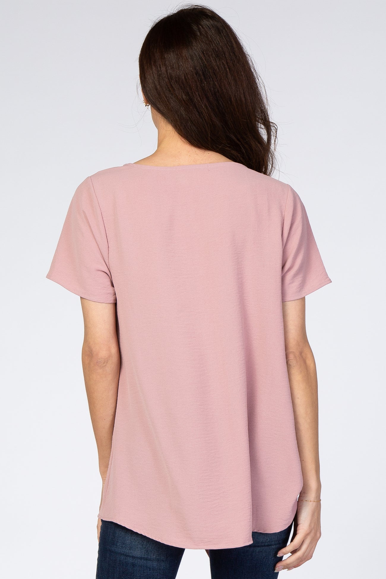 A solid hued top featuring a button accent on front, a tie accent on hemline, a v-neckline, and short sleeves.