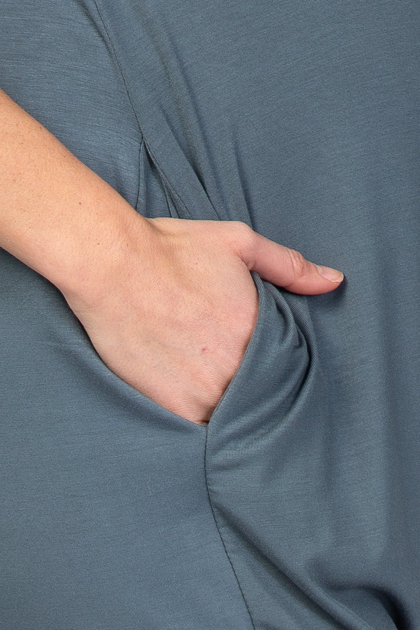 A solid short sleeve maternity jumpsuit. Pocketed. Keyhole opening and button closure in back.