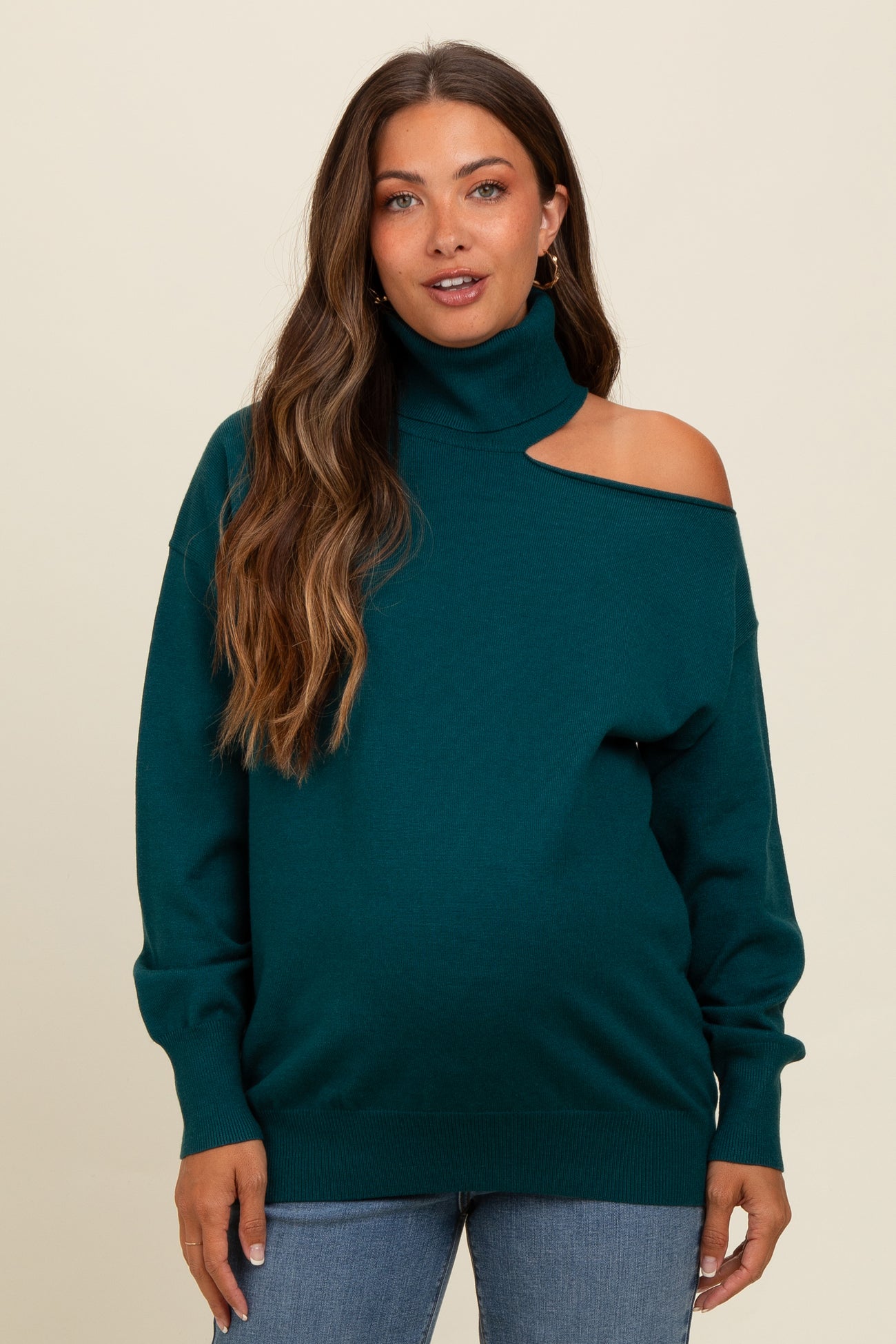 Dark Teal Cold Shoulder Turtle Neck Maternity Sweater
