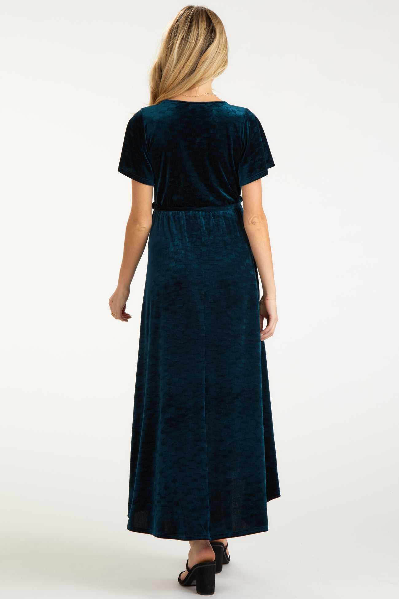 Dark Teal Velvet Wrap Front V-Neck Hi-Low Maternity Midi Dress