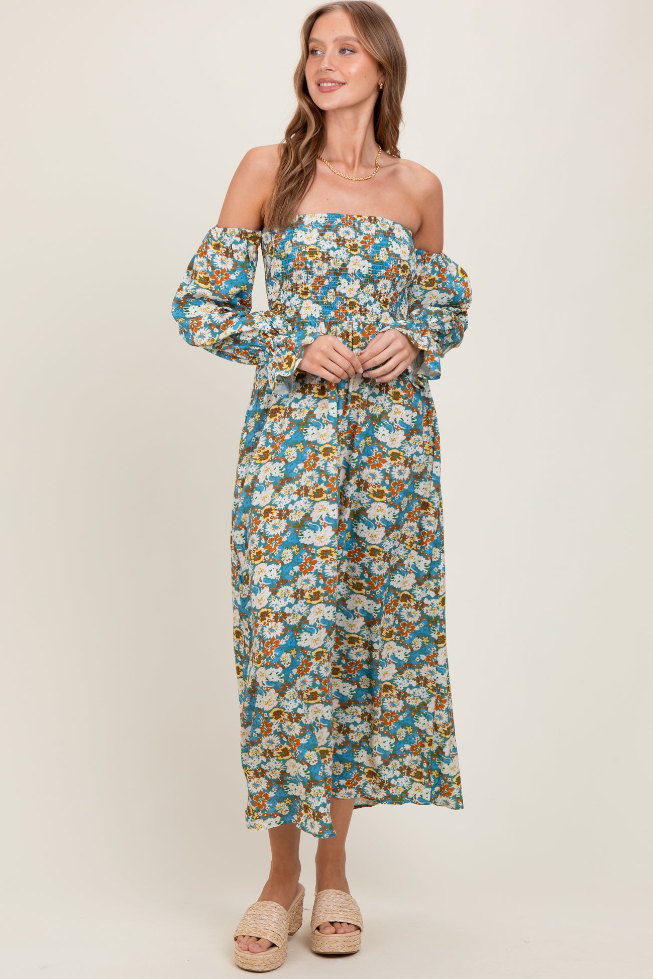 Deep Teal Floral Print Off Shoulder Smocked Maxi Dress