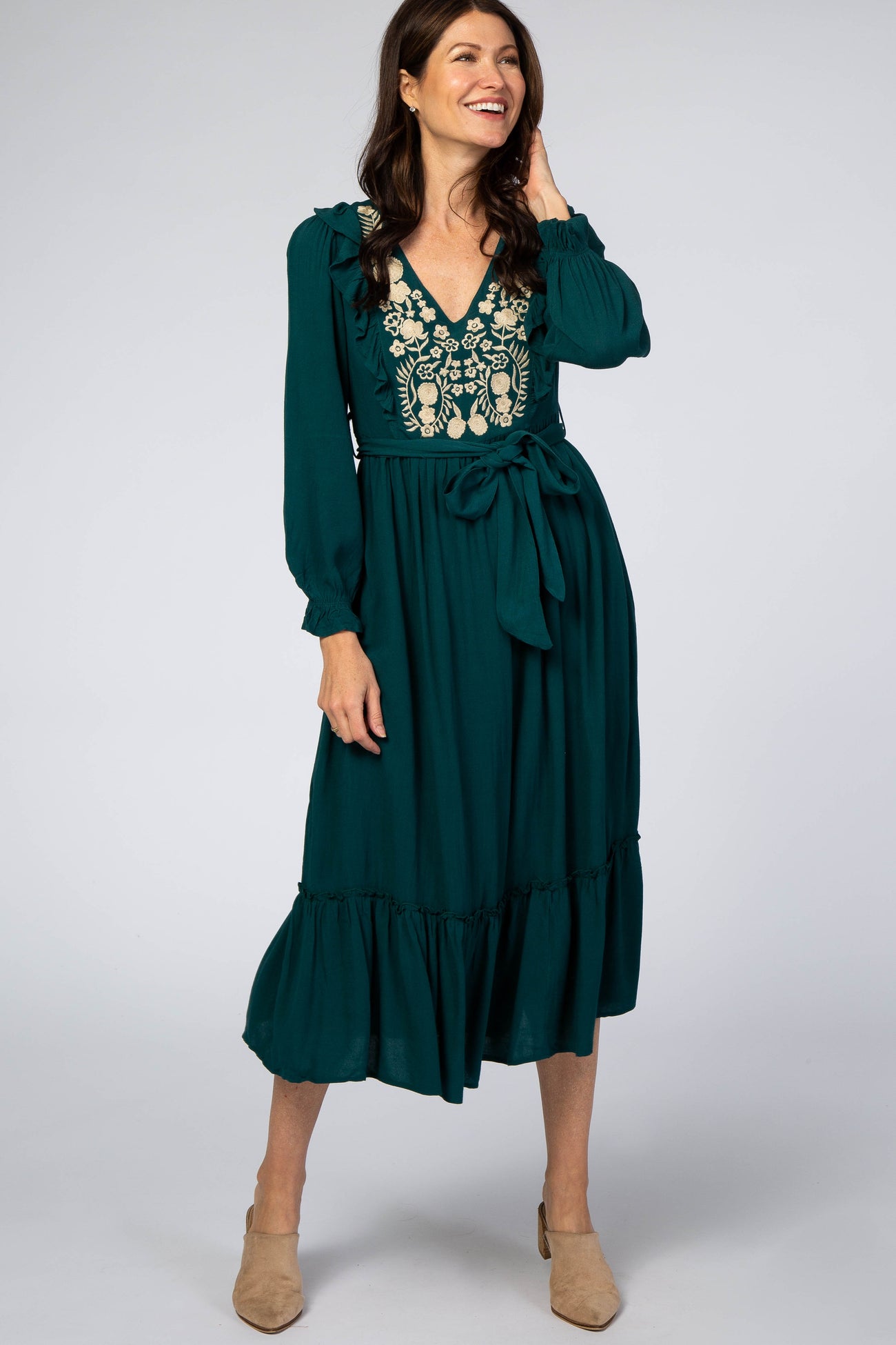 Details A midi dress featuring floral embroidery, long sleeves, ruffle accents, a self tie back, a waist tie and a v-neckline. Dress is double lined to prevent sheerness. Content + Care