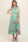 A lightweight printed maternity midi dress with a ruffle mock neck and tie detail v-neckline.