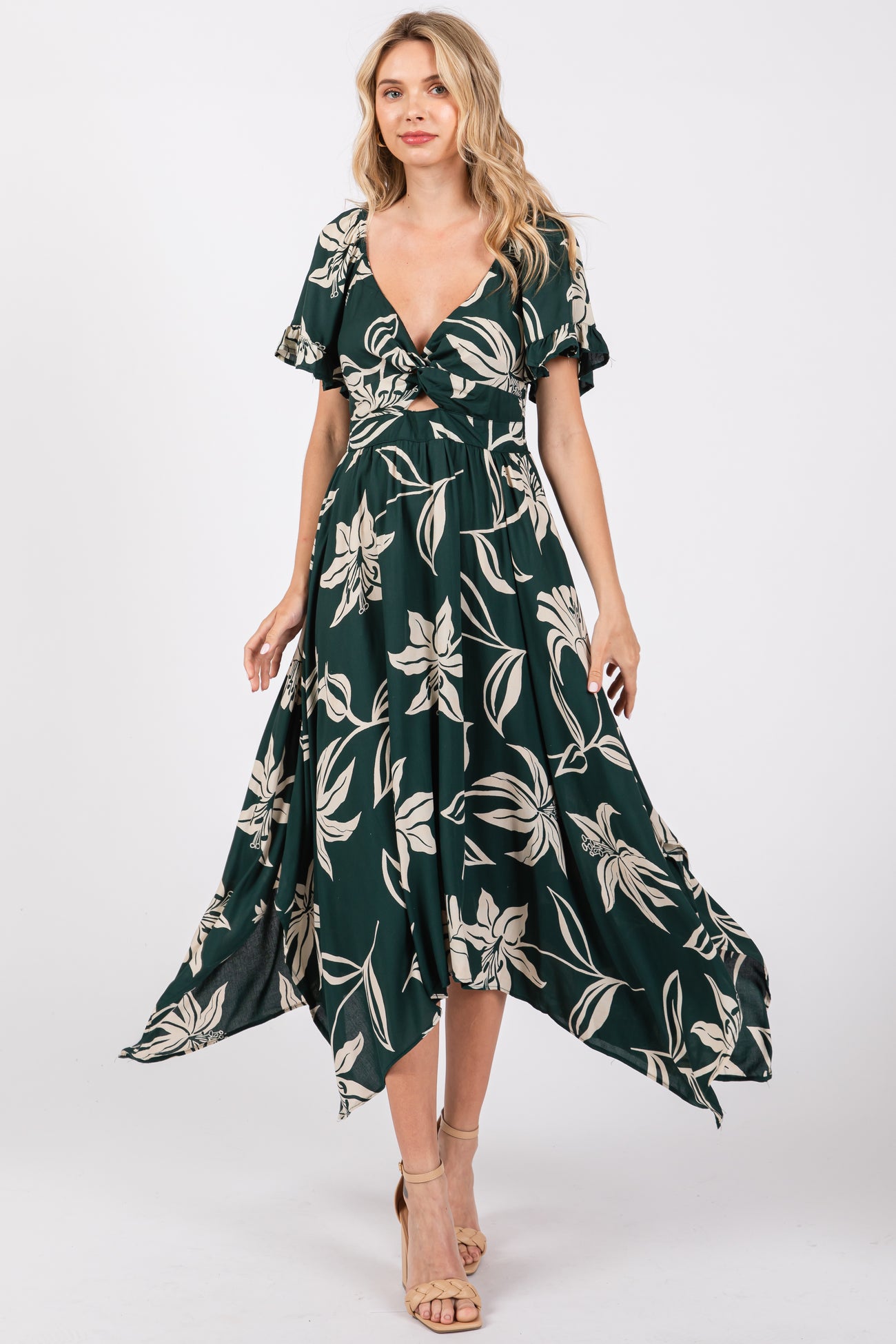 Forest Green Floral Knot Front Short Sleeve Asymmetrical Hem Maternity Maxi Dress