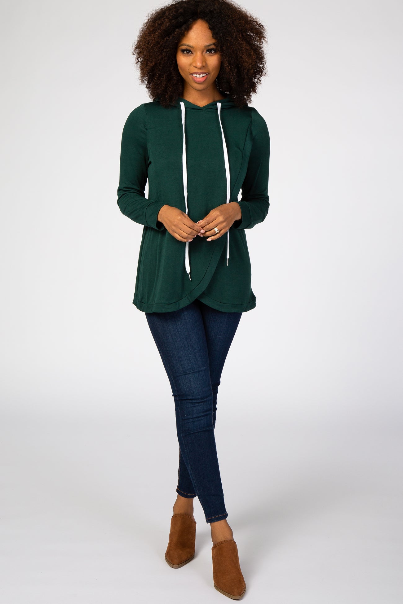 An ultra soft knit nursing top featuring fleece lining, an adjustable drawstring hood, long sleeves and a layered front for easy access.