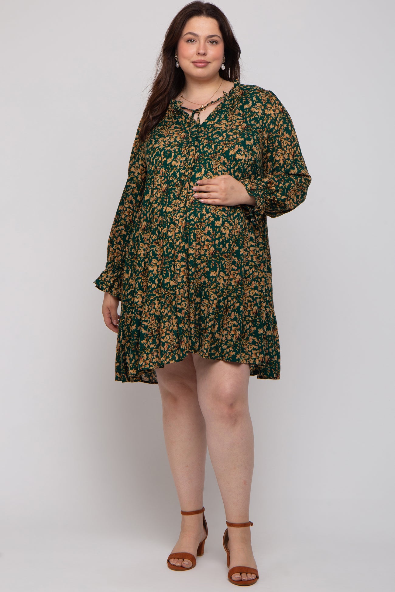 A leaf print maternity plus size dress with a ruffle accent collar, a front tie, long cinched sleeves, and a tiered skirt.