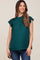 A solid maternity blouse featuring a smocked mock neck, flutter sleeves and a back keyhole cutout with a button closure.