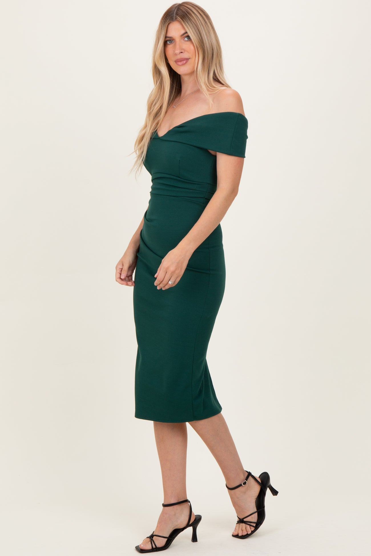 Elevate your elegance with our Forest Green Off Shoulder Fitted Midi Dress. This stunning piece features a flattering off-shoulder neckline that beautifully highlights your collarbones and shoulders. The fitted silhouette hugs your curves, creating a sleek, sophisticated look perfect for evening events, date nights, or special occasions. Crafted from a comfortable, stretchy fabric, this midi dress offers both style and ease of movement. The deep forest green shade adds a touch of timeless luxury and pairs effortlessly with your favorite heels and accessories. Step out in confidence and grace with this wardrobe must-have.