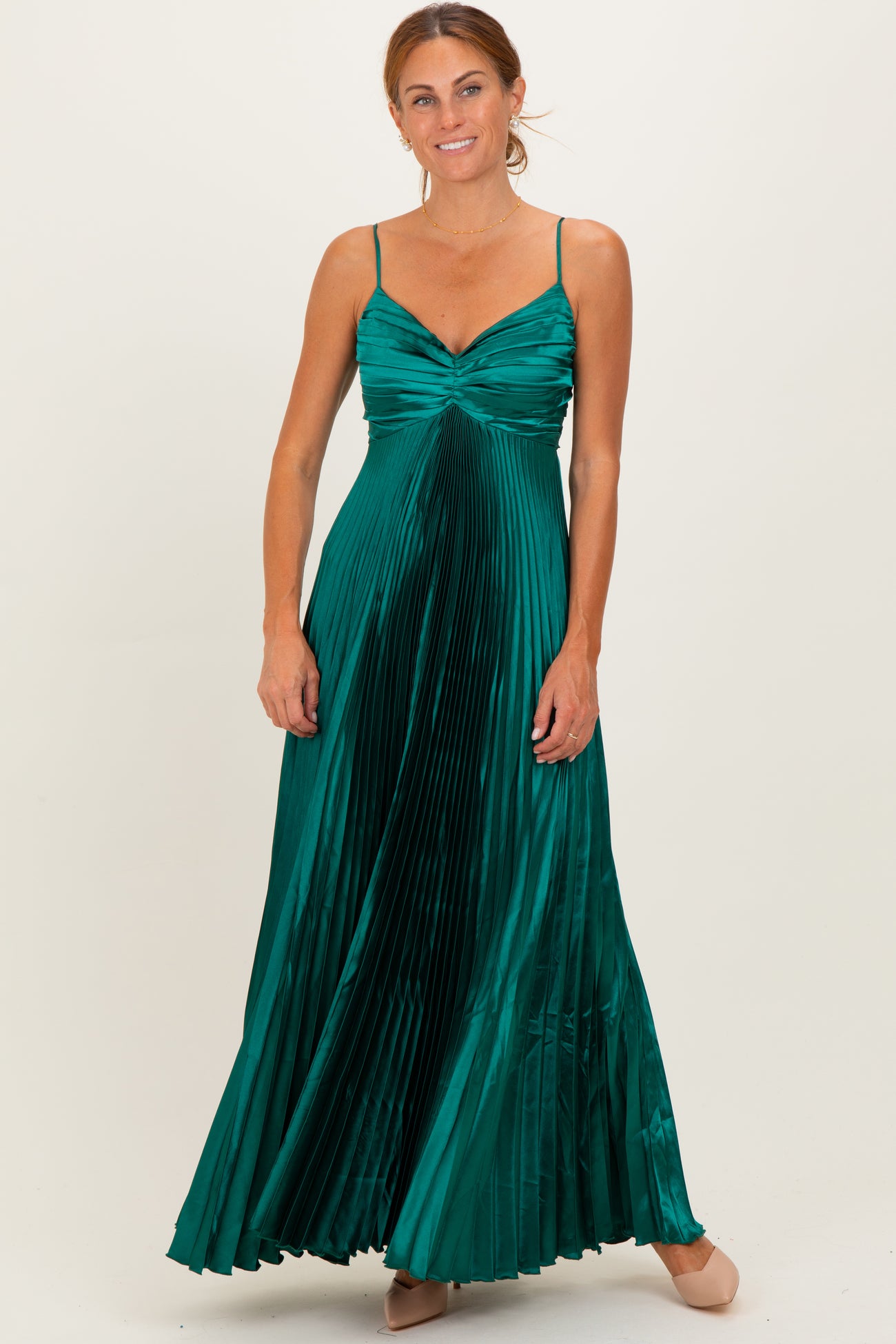 Forest Green Pleated Satin Sleeveless Maxi Dress