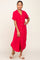 A solid maxi dress featuring functioning front buttons, a collar, two front pockets, cuffed short dolman sleeves, and a hi-low rounded hemline.