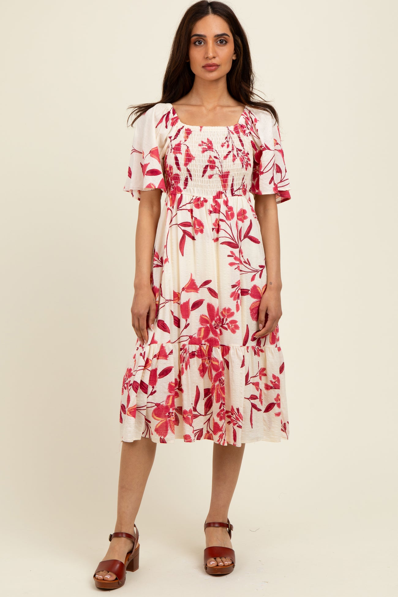 Fuchsia Floral Smocked Flutter Sleeve Midi Dress