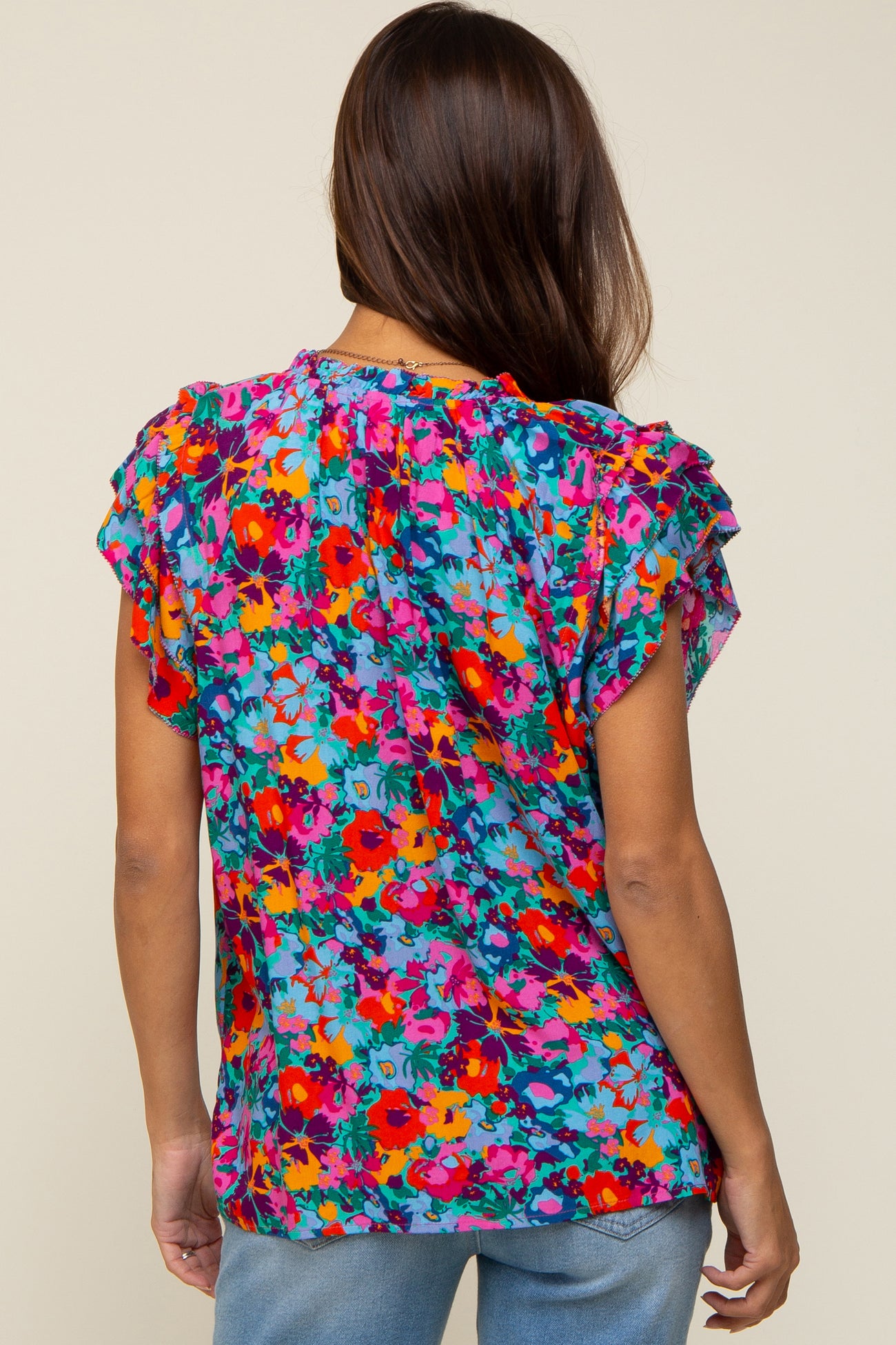 A multi-colored floral print maternity top featuring a v-neckline with ruffle trim and an adjustable tie and short sleeves with ruffle layers.