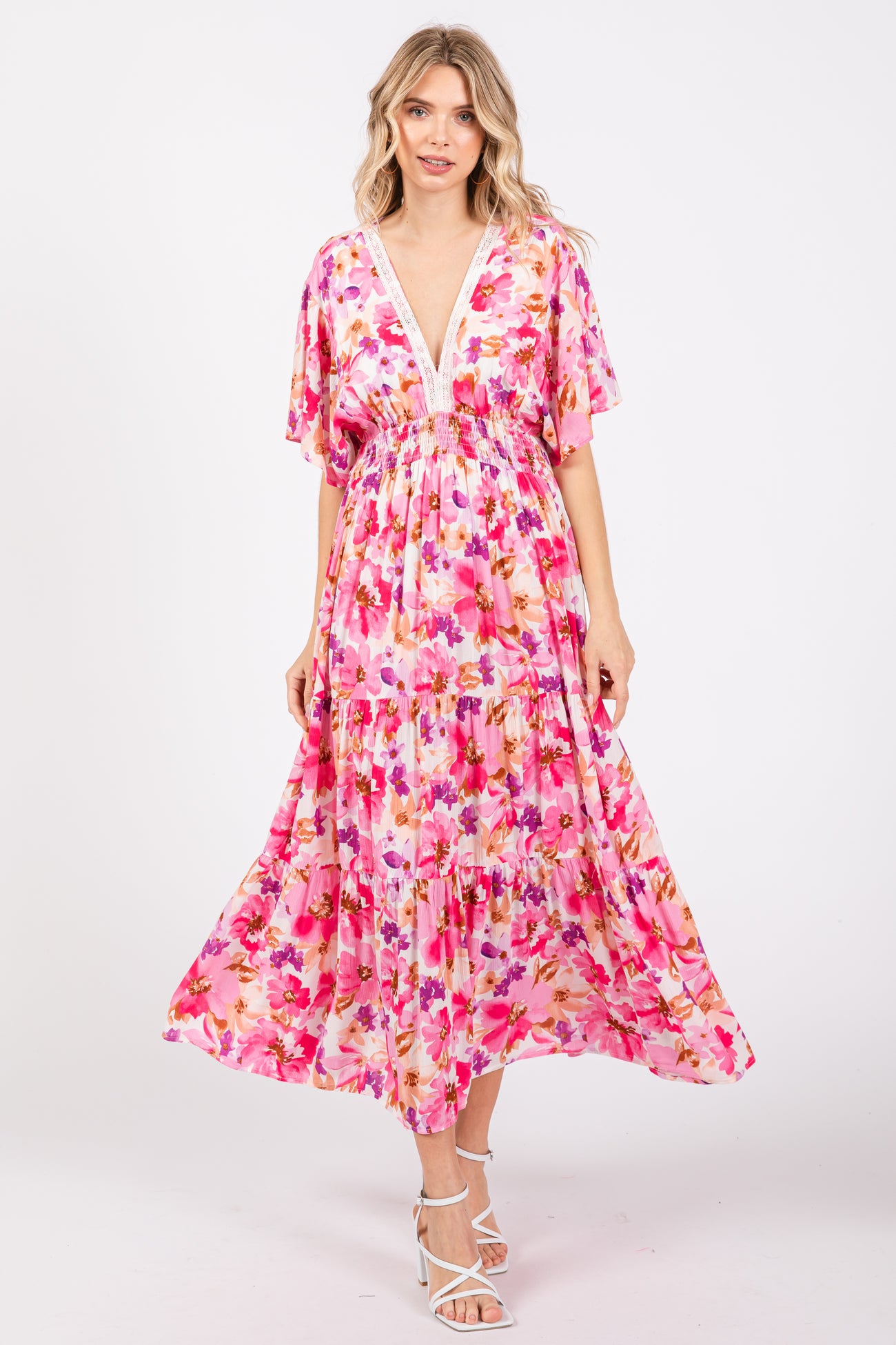 A multi-color floral maternity maxi dress featuring short sleeves, a tiered skirt and a lace trim v-neckline.