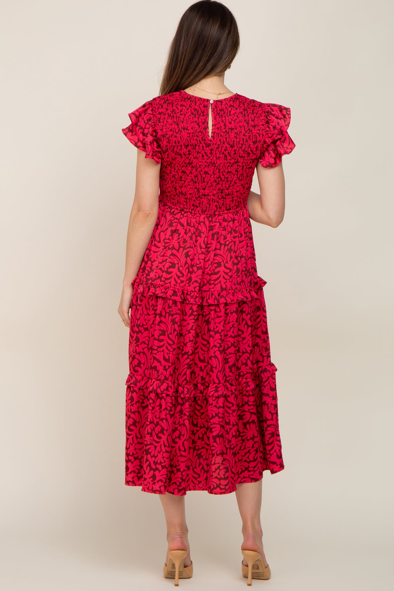 Fuchsia Print Smocked Ruffle Tiered Maternity Midi Dress