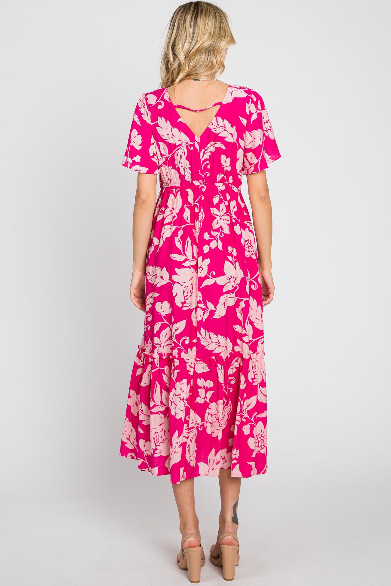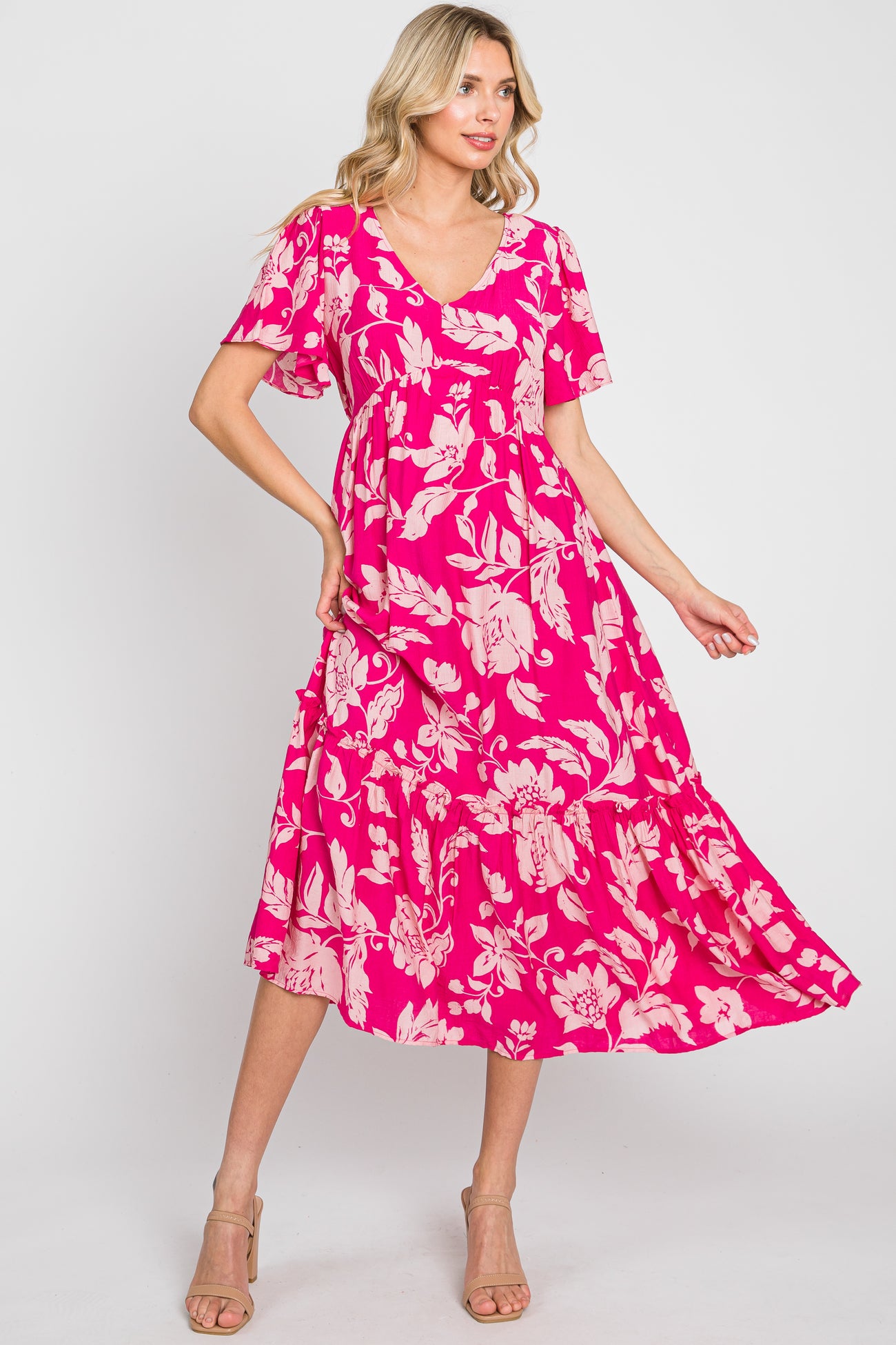 A printed midi dress with a tiered ruffle skirt, v-neckline, and flowy sleeves.