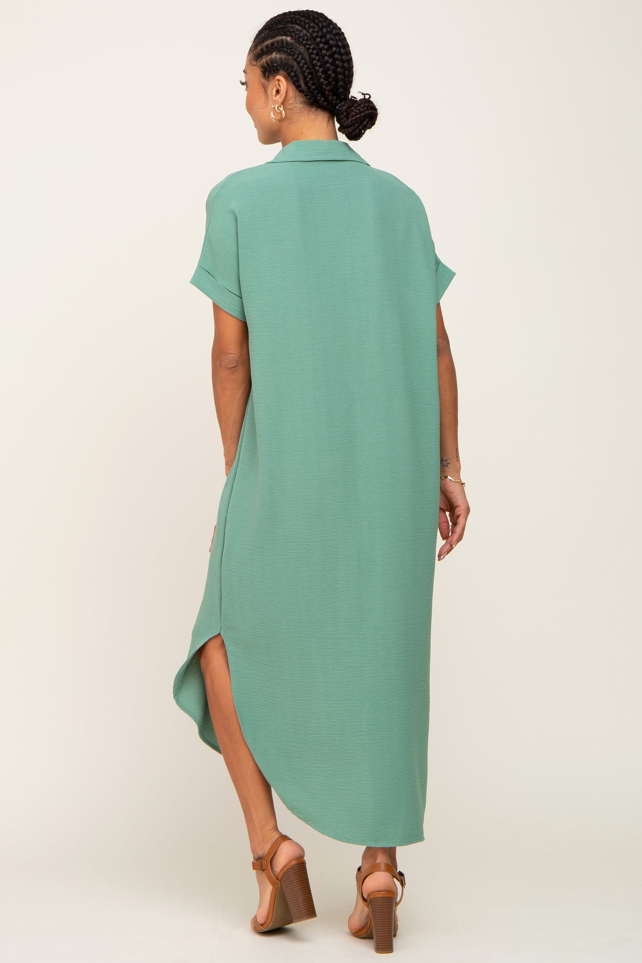 A solid maxi dress featuring functioning front buttons, a collar, two front pockets, cuffed short dolman sleeves, and a hi-low rounded hemline.
