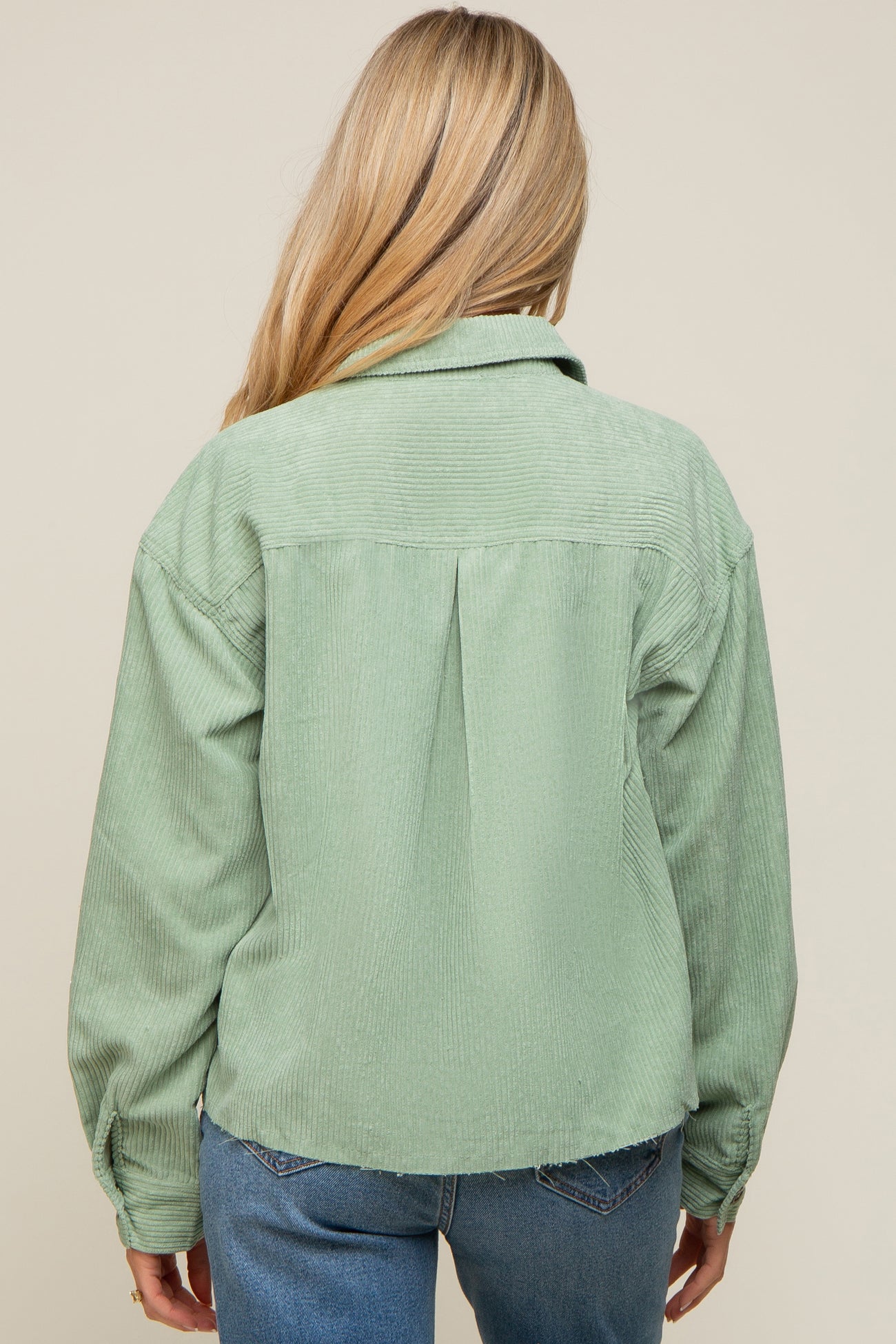 A corduroy maternity shacket featuring a button front, a collar neckline, long sleeves and a raw edge hem.