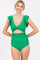 A one piece swimsuit featuring flutter sleeves, a cutout knotted front, a back cutout, a back closure and removable padding at the bust.