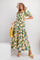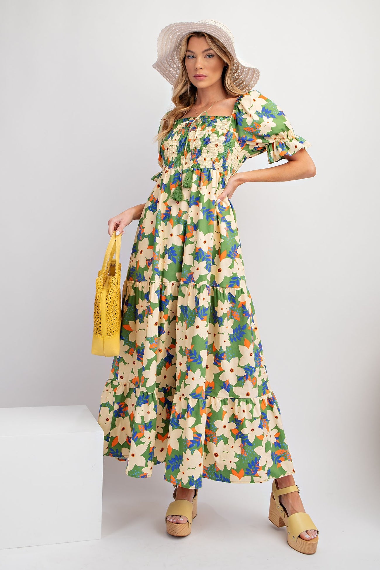 Floral smocked bodice dress with short puff sleeve, tiered skirt, square neckline, side pockets, and a front tie.