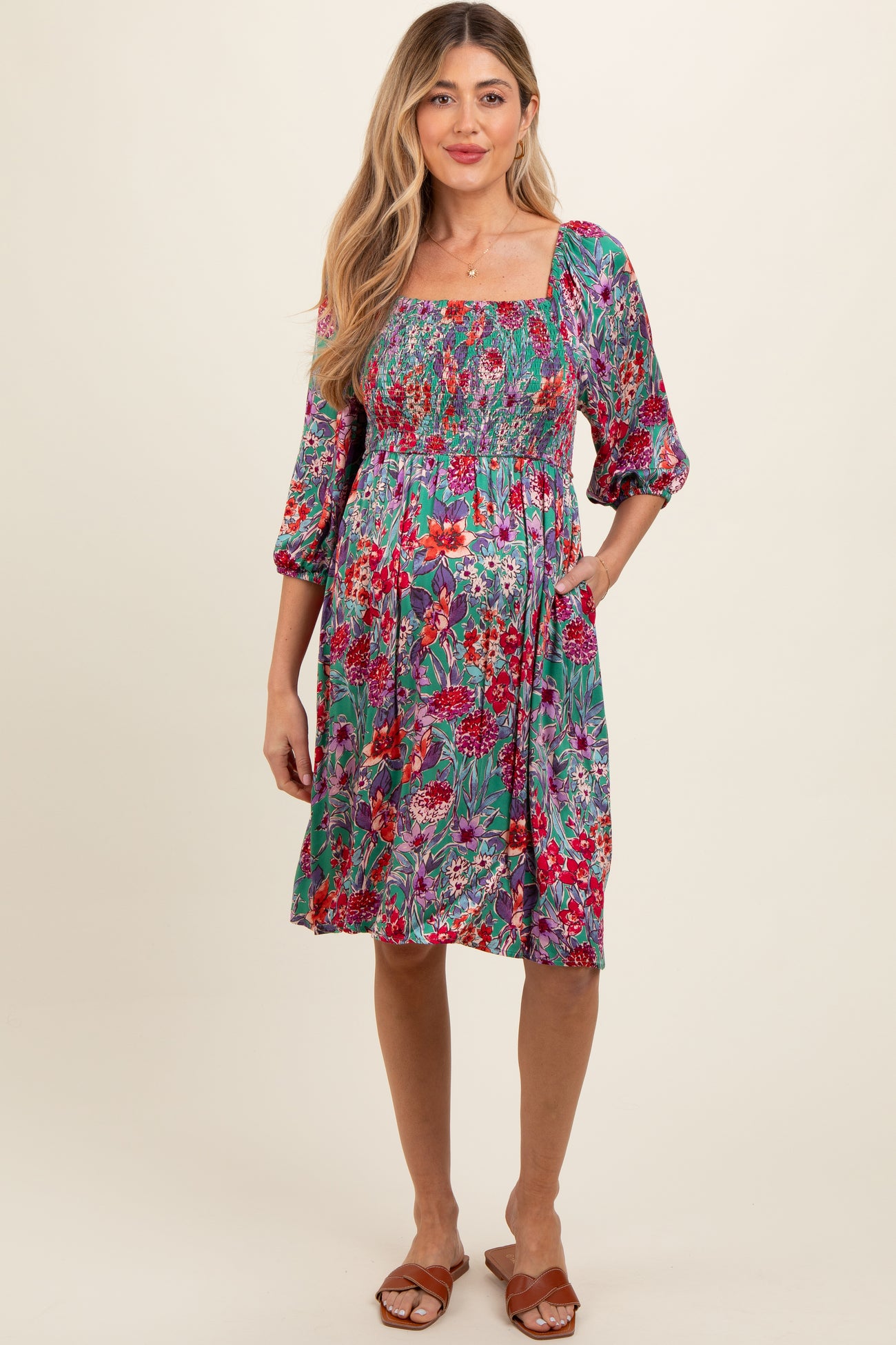 A floral maternity knee-length dress with a squared neckline, half-length sleeves, a smocked top, and side pockets.
