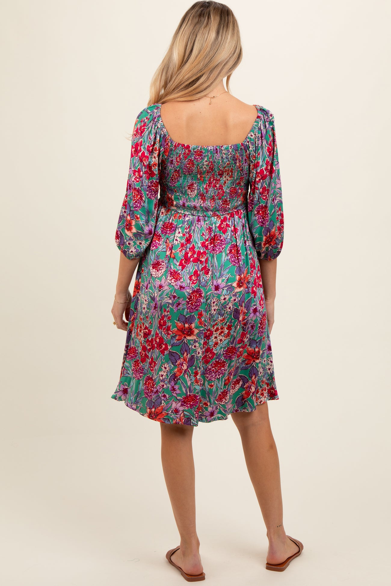Green Floral Smocked Knee-Length Maternity Dress