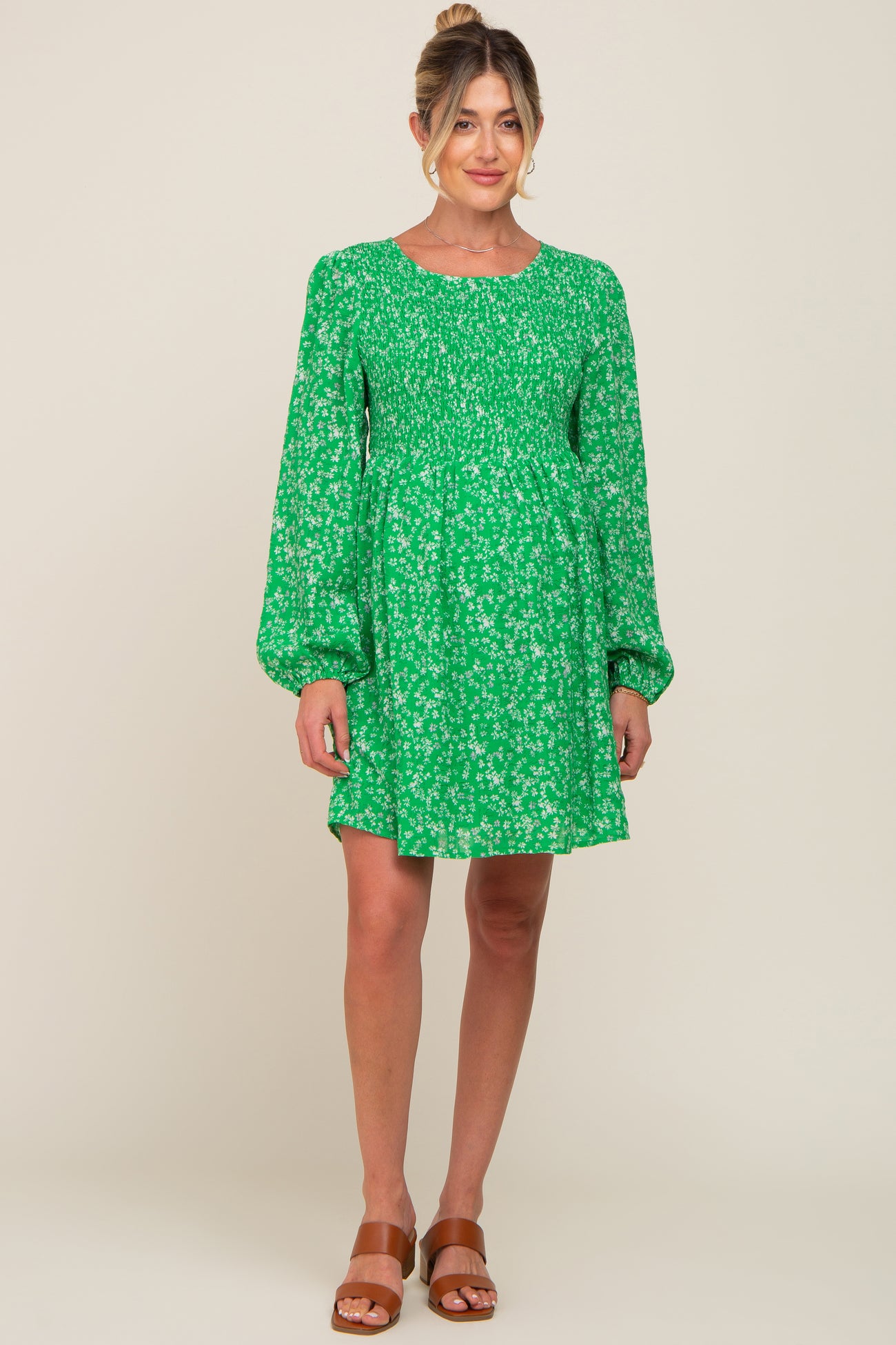 Black floral maternity dress with a rounded neckline, a smocked bodice, long sleeves, and a back keyhole button closure. Skirt is lined.