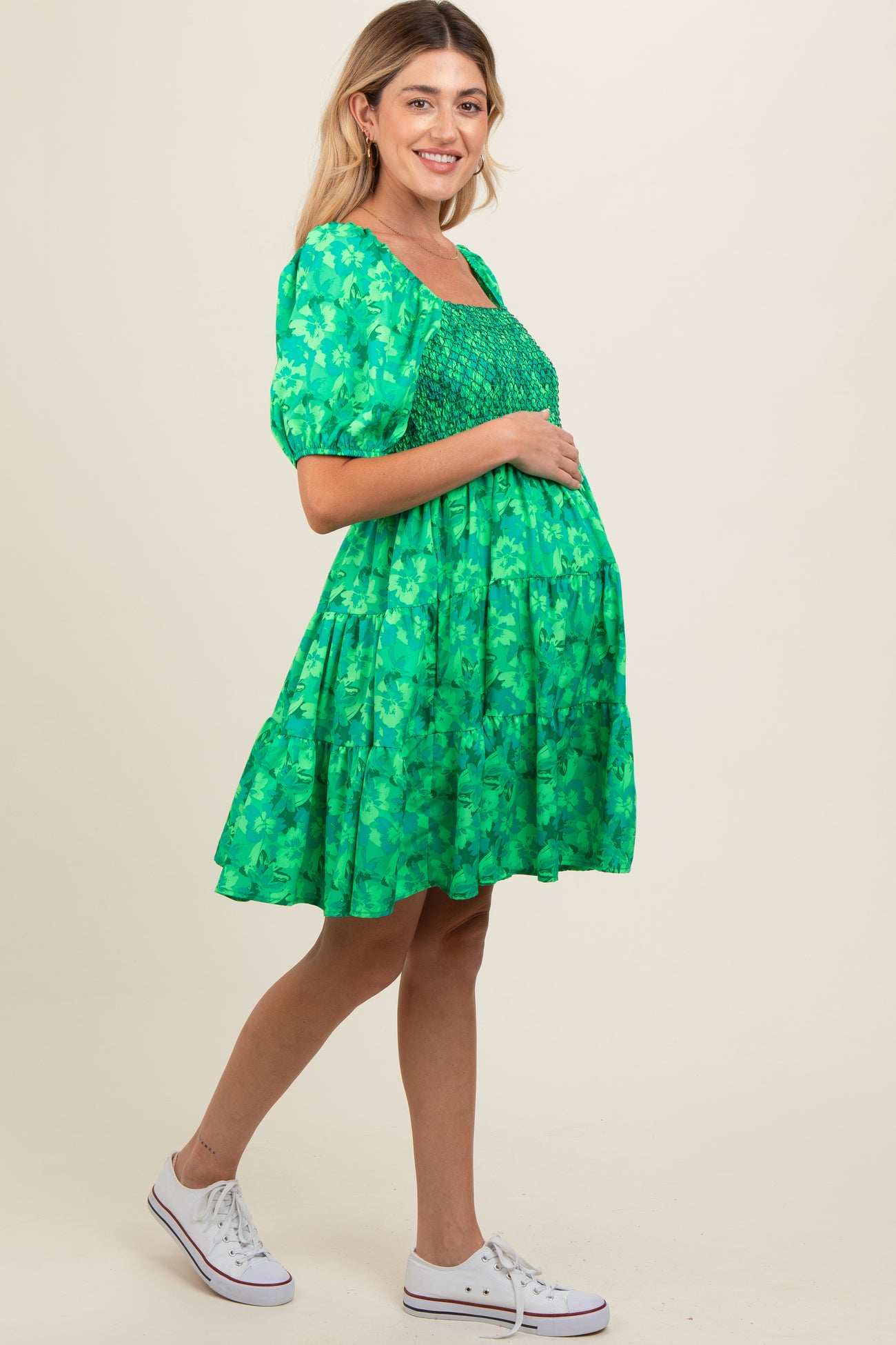 Green Floral Smocked Tiered Maternity Dress