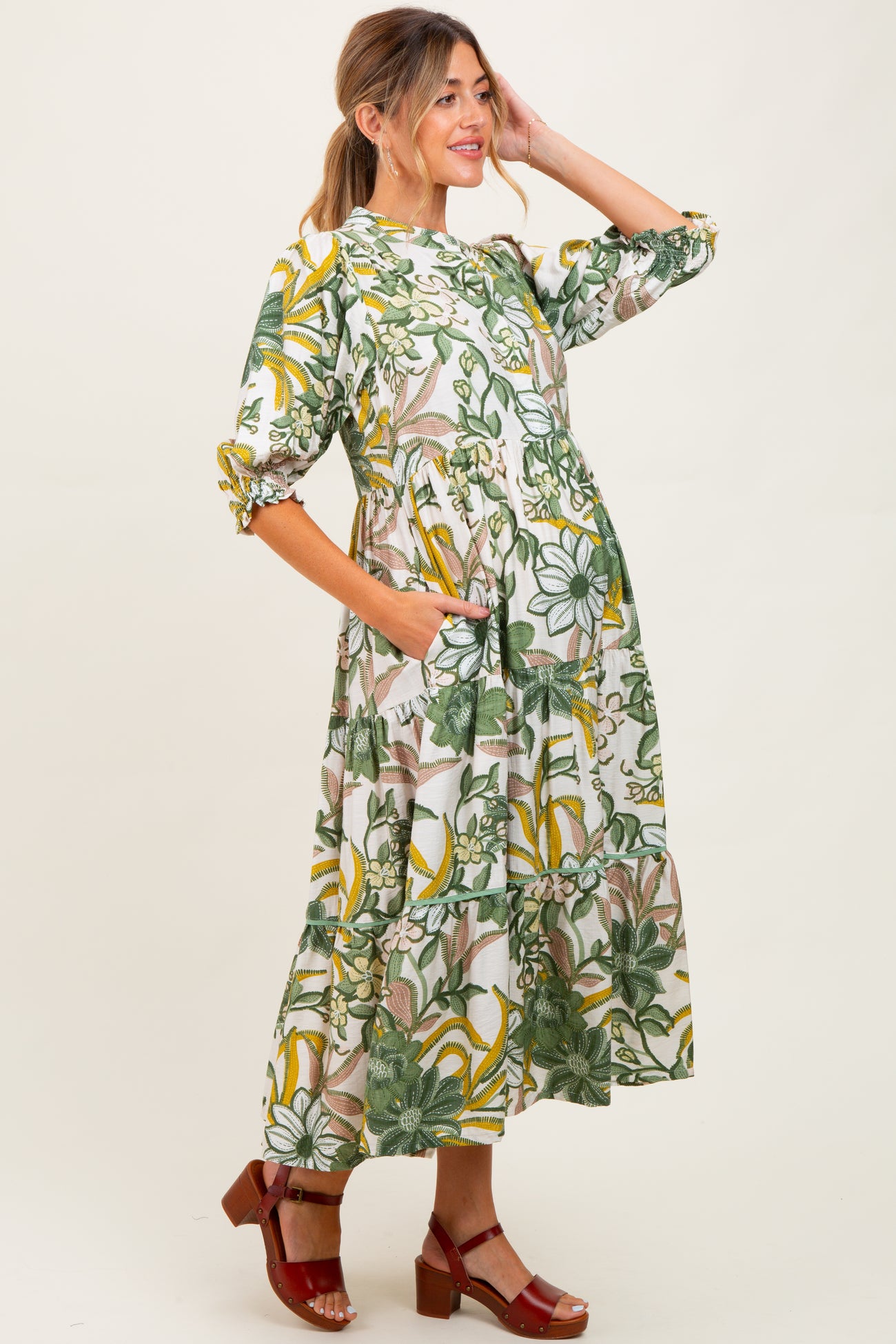 Embrace comfort and style with our Green Floral Tiered Short Sleeve Maternity Midi Dress. Featuring a vibrant botanical print in soothing green and yellow tones, this dress is designed to celebrate your pregnancy glow. The tiered silhouette and breathable fabric provide a relaxed fit that grows with you, while the short puff sleeves add a charming touch. Perfect for casual outings or special occasions, its midi length offers versatility and ease. Pair with sandals or flats for a breezy, elegant maternity look you'll love throughout your journey.