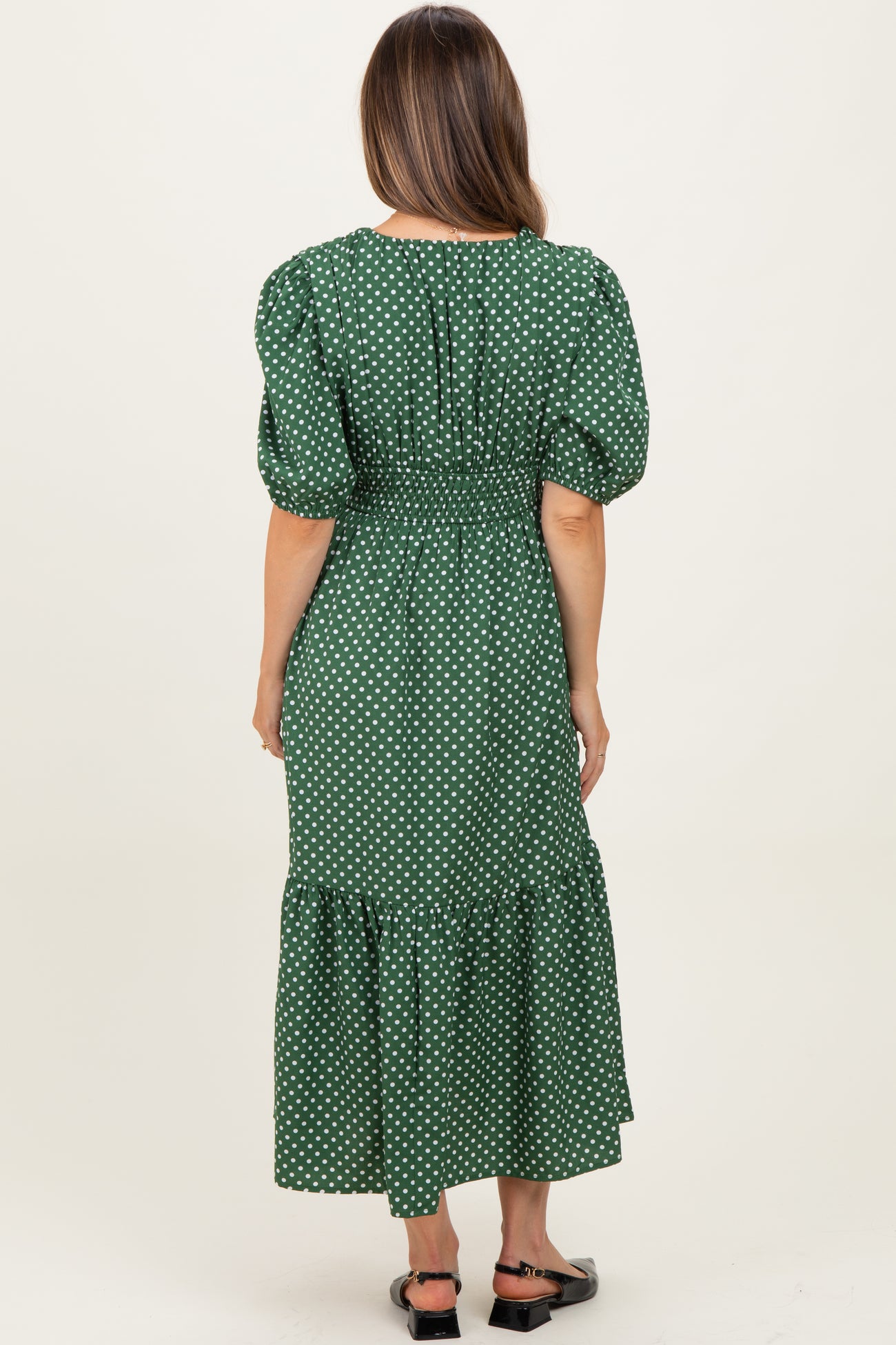 Embrace comfort and style with our Coffee Polka Dots V Neck Flowy Maternity Dress. Designed to flatter your growing bump, this dress features a charming green base adorned with classic white polka dots. The V-neckline and puffed short sleeves add a touch of elegance while the cinched empire waist provides gentle support and a perfect fit from early pregnancy to postpartum. Made from lightweight, breathable fabric, it flows beautifully for all-day comfort. The tiered skirt offers extra movement and a trendy silhouette. Ideal for casual outings or special occasions, this dress is a must-have for every maternity wardrobe.