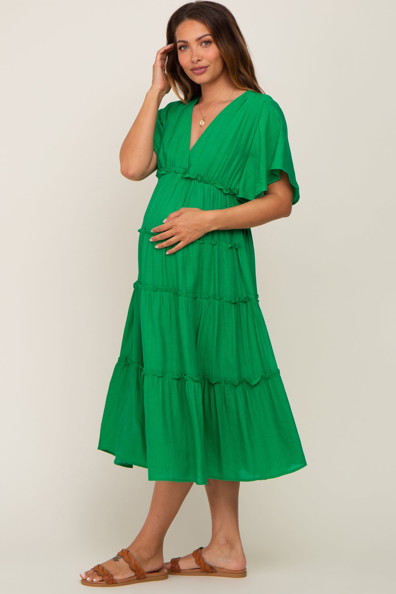 Green Ruffle Tiered V-Neck Maternity Midi Dress