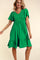 A solid midi dress with a smocked bust, flutter sleeves and ruffle hem. Pocketed.