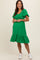 A solid maternity midi dress with a smocked bust, flutter sleeves and ruffle hem. Pocketed.