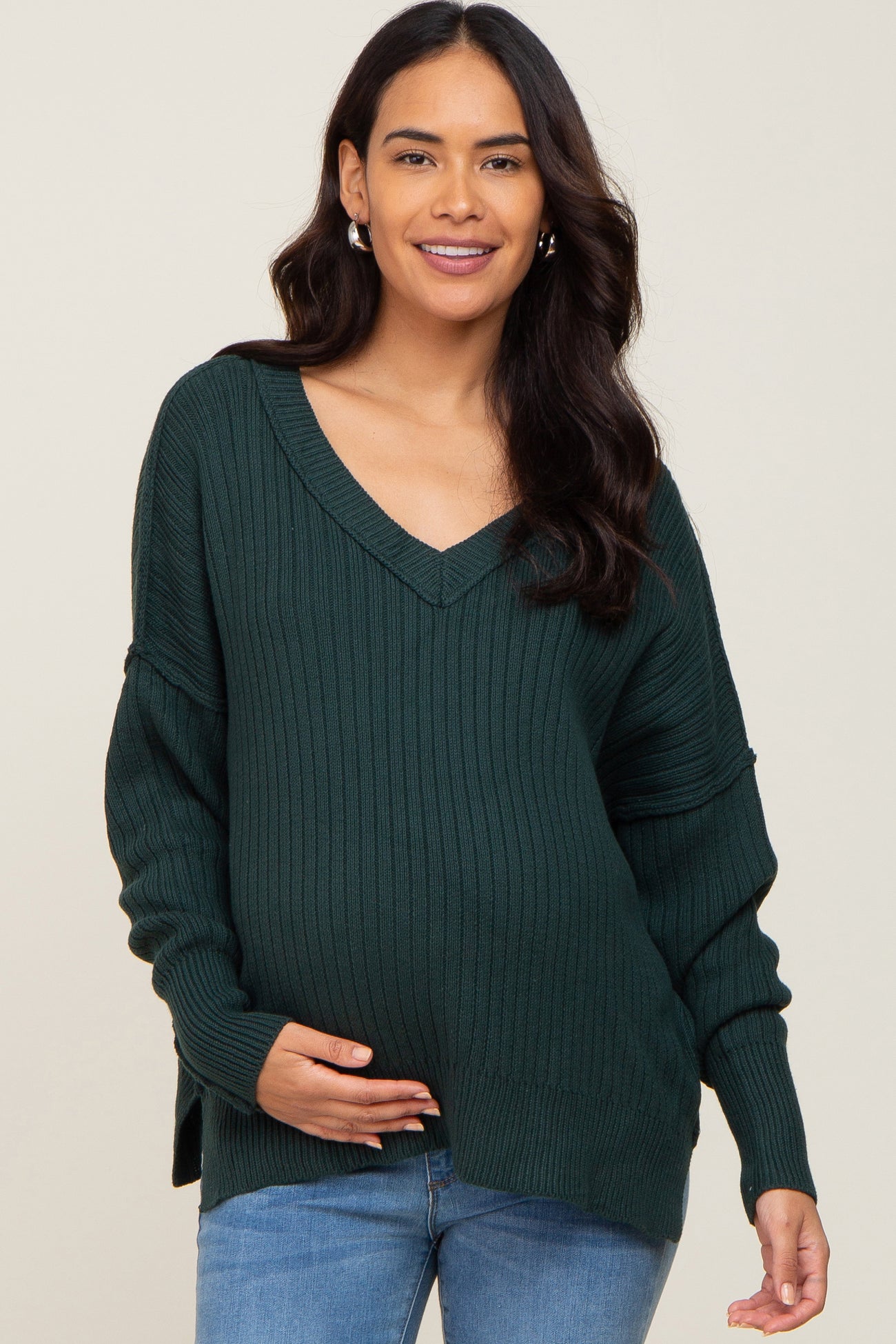 A deep v-neck oversized ribbed knit maternity sweater with dolman sleeves.