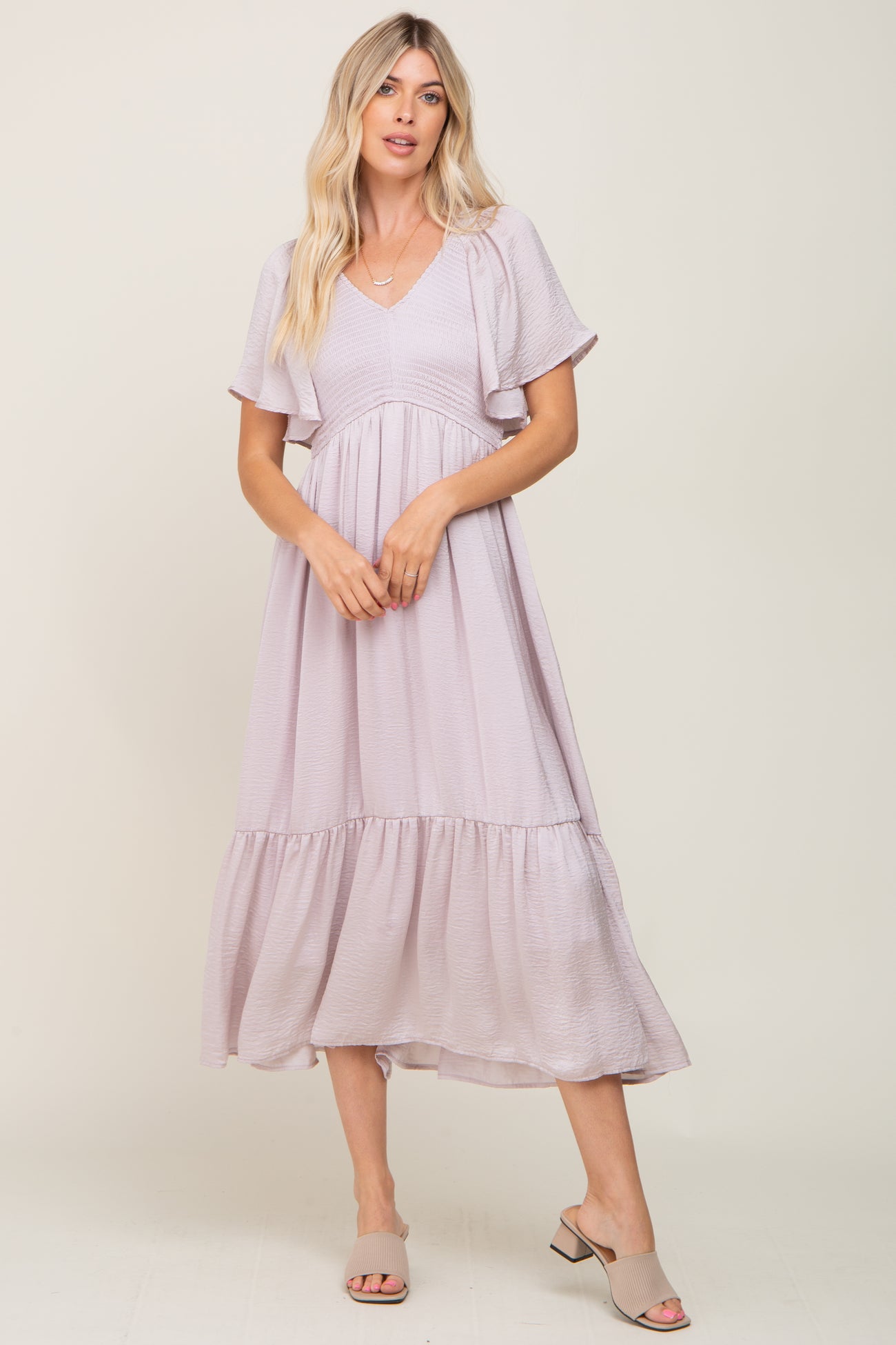 Grey Lavender Satin Smocked Maternity Midi Dress