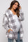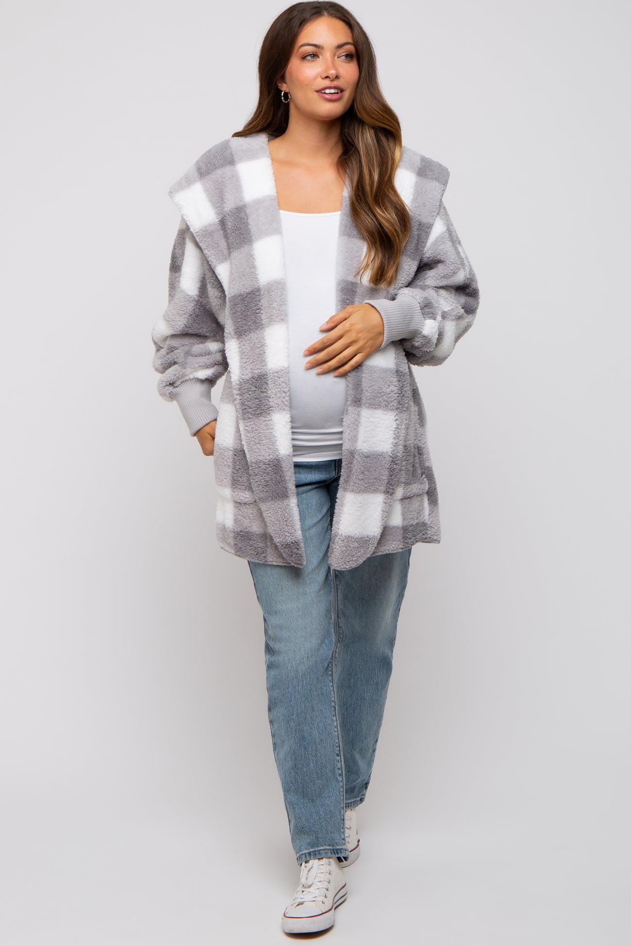 A plaid maternity cardigan featuring an open front, a hoodie, side pockets, and contrast ribbed cuffs.