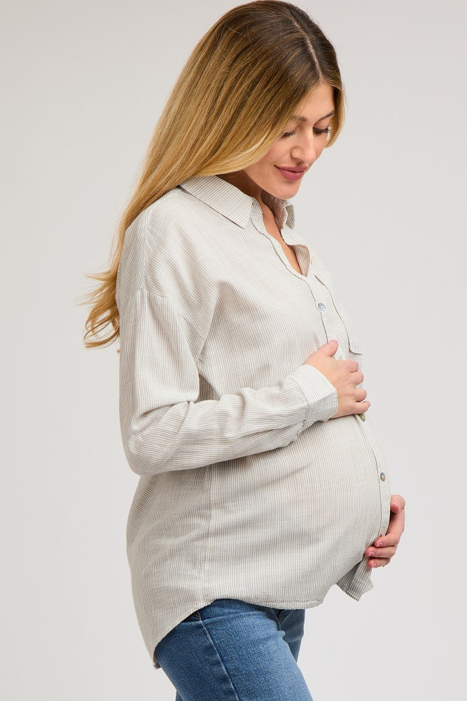 Grey Striped Basic Button Down Maternity Top