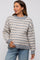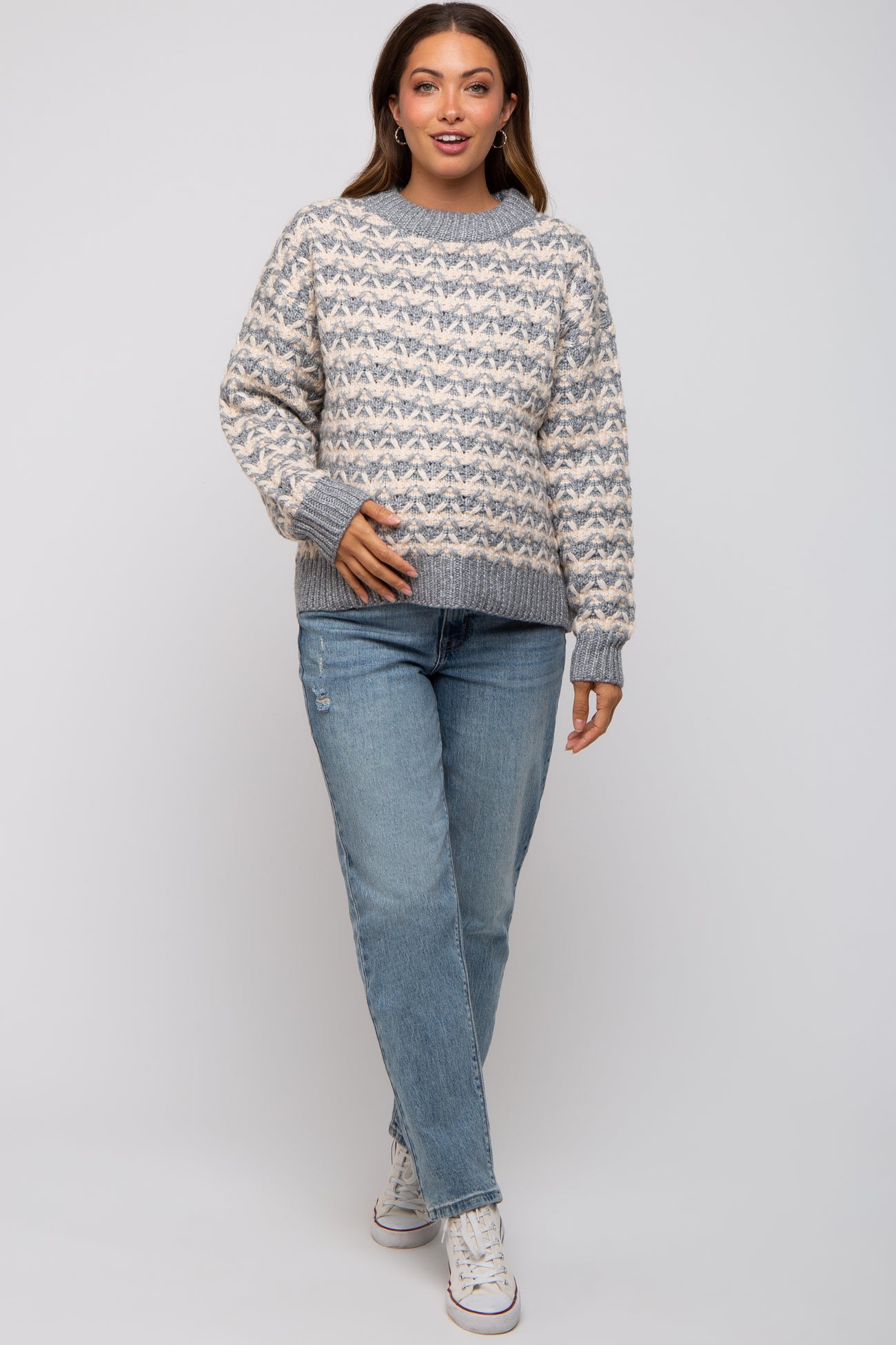 A striped open knit maternity sweater with a rounded neckline. Ribbed along the neckline, sleeves, and bottom hem.