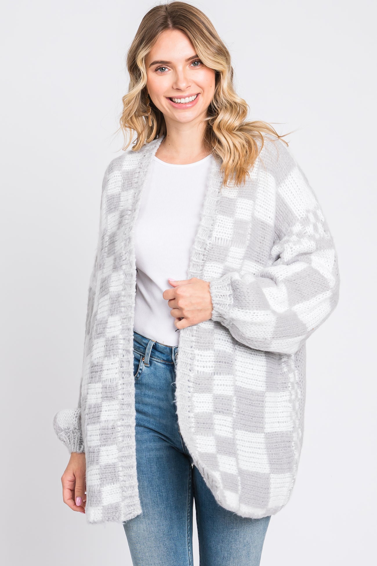 Details A checkered maternity cardigan with an open front and long sleeves. Content + Care