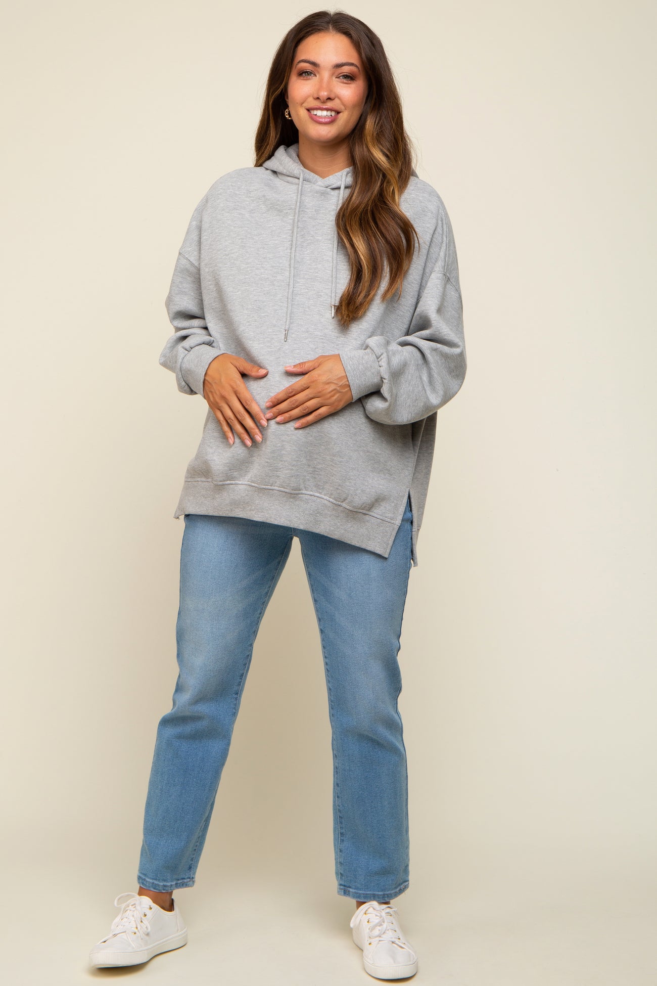 A solid hued maternity hoodie featuring an adjustable drawstring and long sleeves.