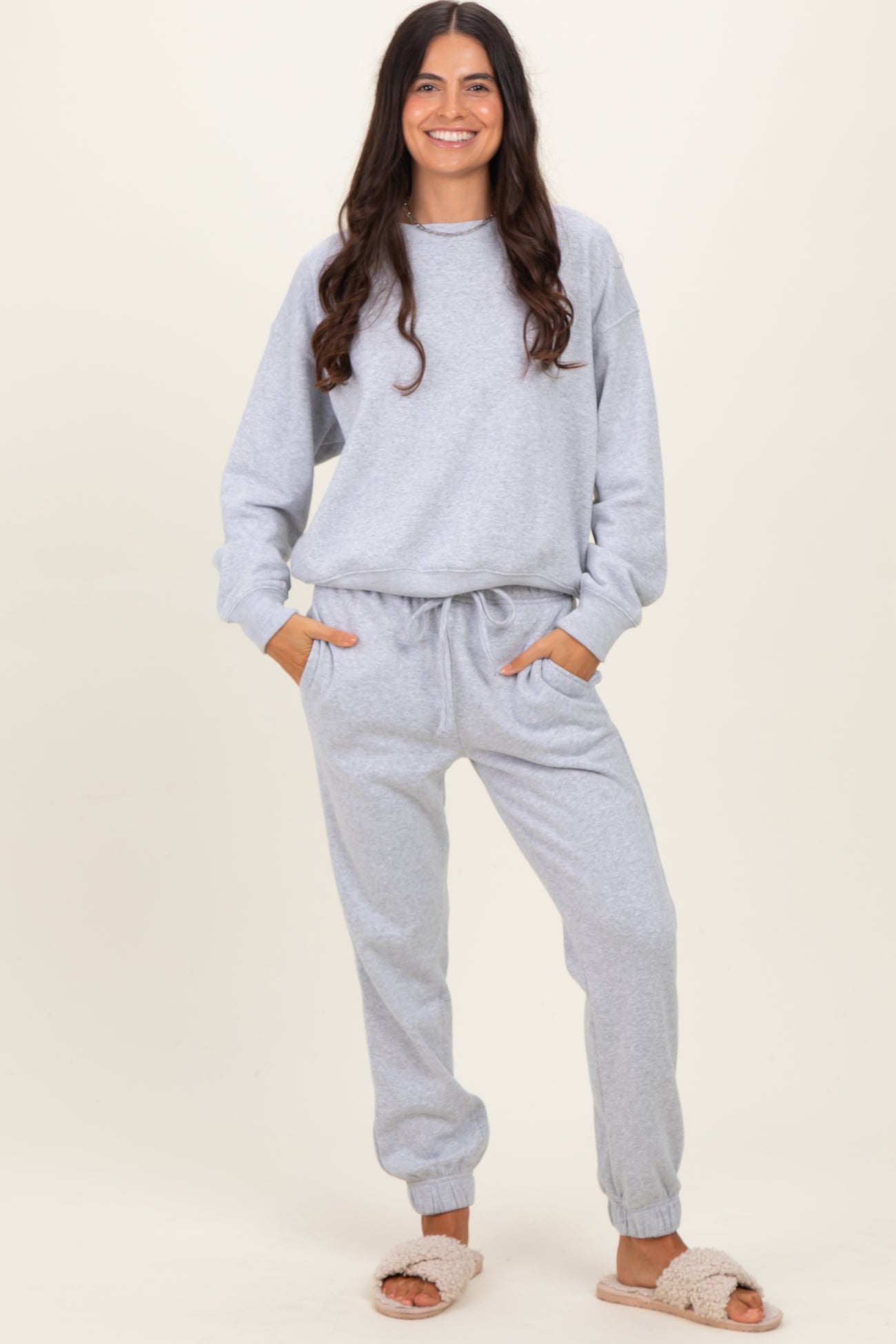 Stay cozy and stylish with our Heather Grey Fleece Long Sleeve Pullover & Jogger Set. Crafted from ultra-soft fleece fabric, this set offers ultimate comfort for lounging or running errands. The pullover features a relaxed fit with ribbed cuffs and a classic crew neckline, while the joggers come with a drawstring waist and cuffed ankles for a perfect fit. Its versatile heather grey shade pairs effortlessly with any casual look. Perfect for cooler days, this set combines warmth and ease for everyday wear. Ideal for relaxing at home or casual outings in laid-back style.