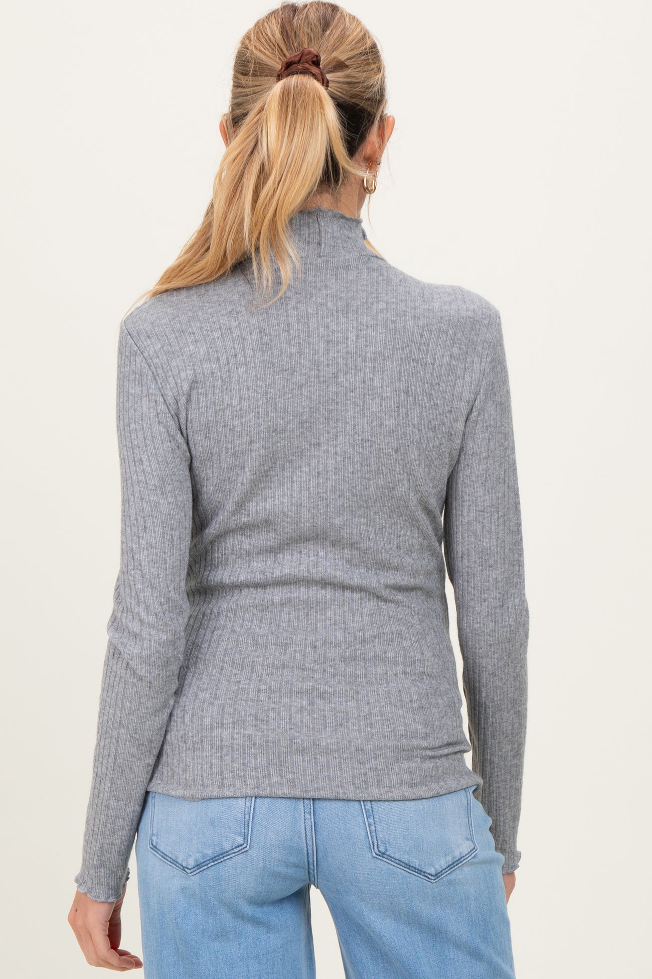 Heather Grey Ribbed Mock Neck Ruffle Hem Maternity Long Sleeve Top