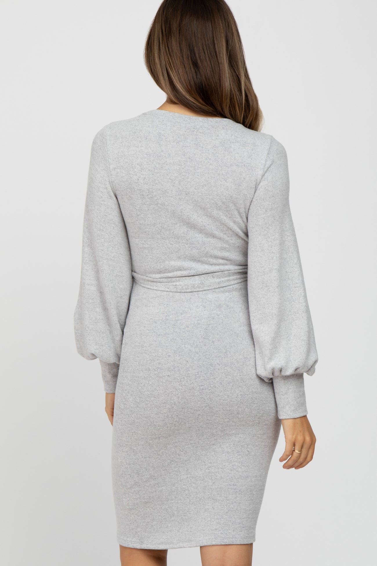 Heather Grey Soft Brushed Waist Tie Bubble Sleeve Maternity Dress