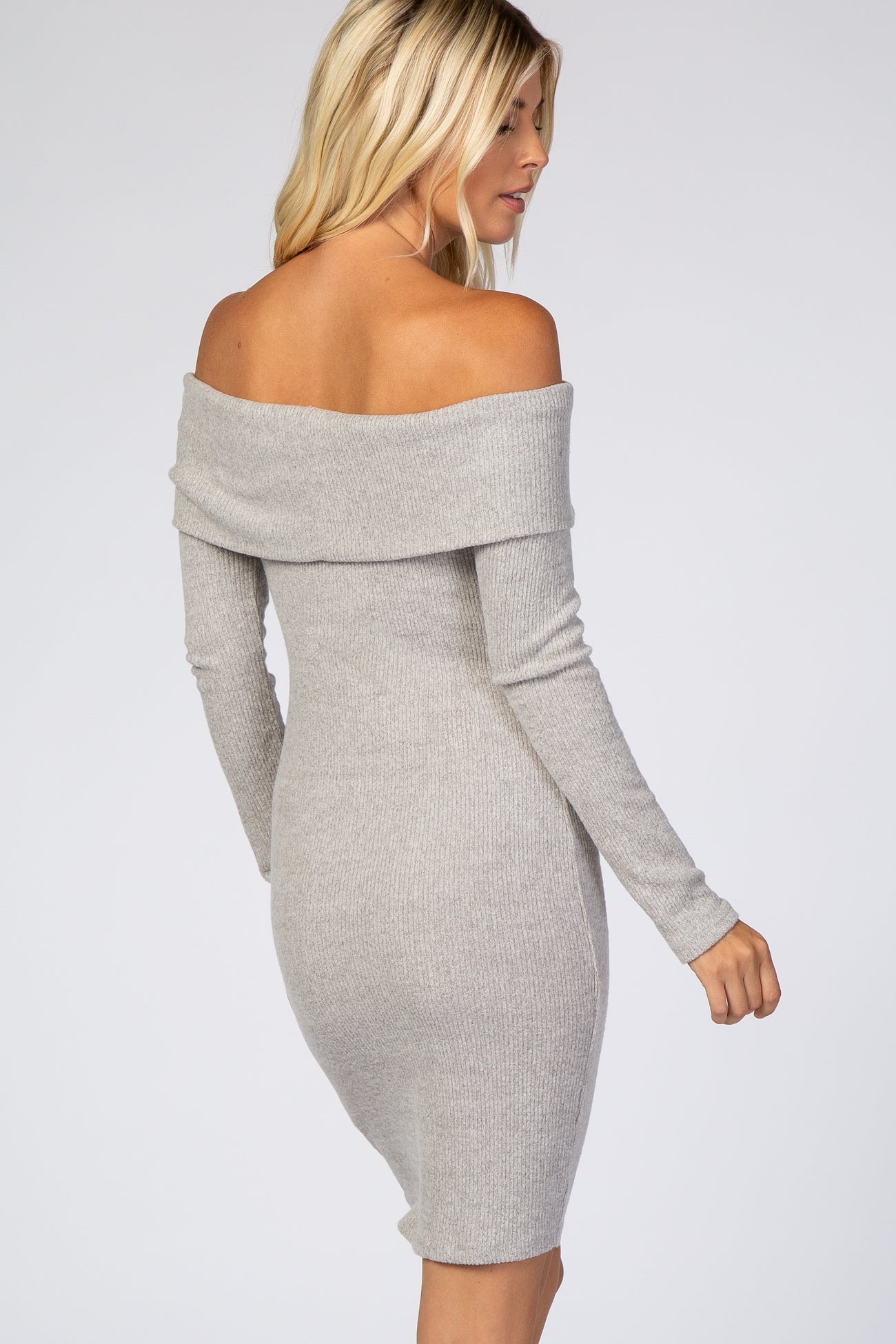 Heather Grey Soft Ribbed Folded Neck Off Shoulder Dress