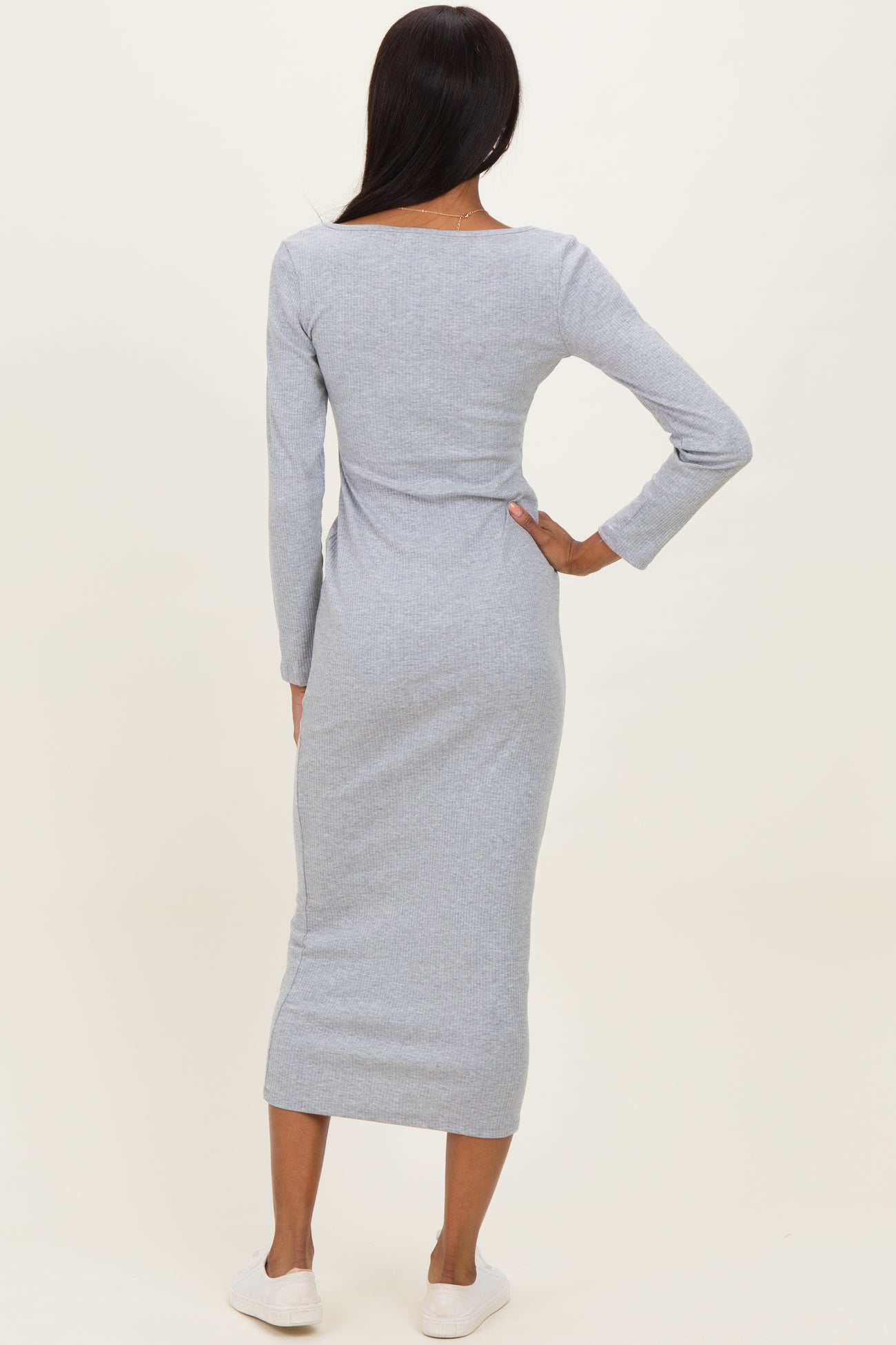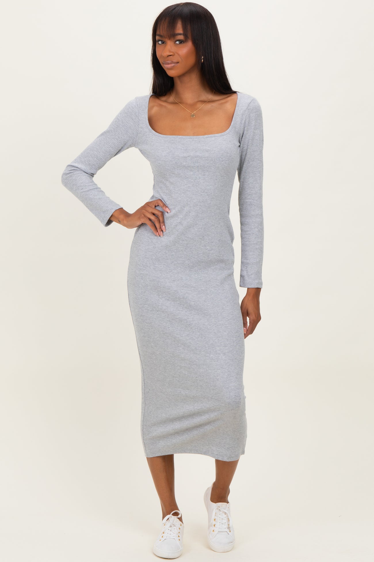 Heather Grey Square Neck Rib Long Sleeve Maxi Dress