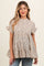 An animal print maternity top featuring short ruffle sleeves, a tiered body, a rounded neckline and a back keyhole cutout with a button closure.