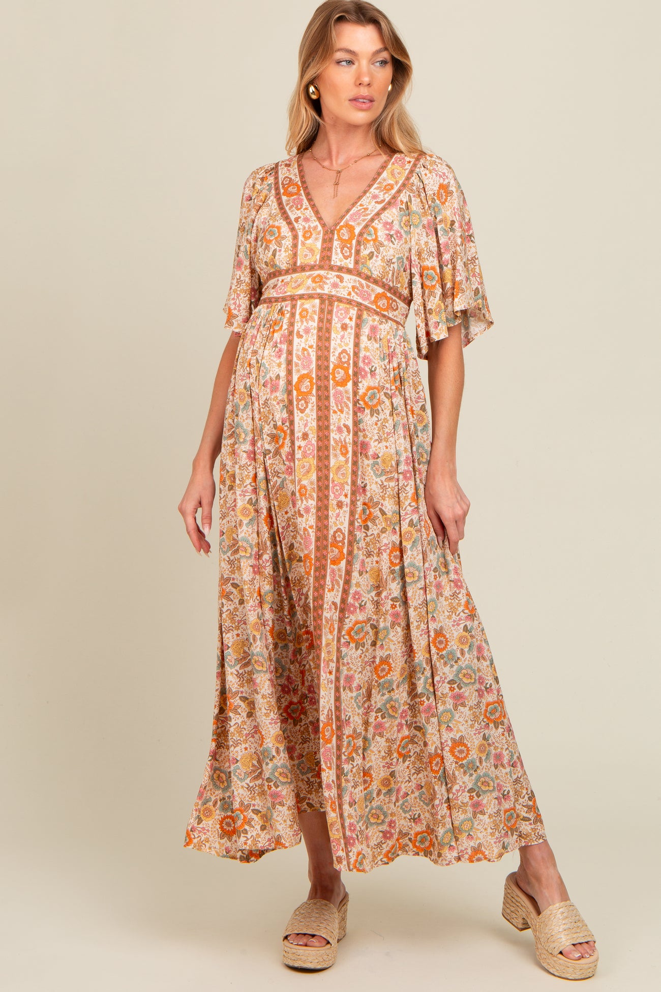 Ivory Floral Border Print Flutter Sleeve Maternity Maxi Dress